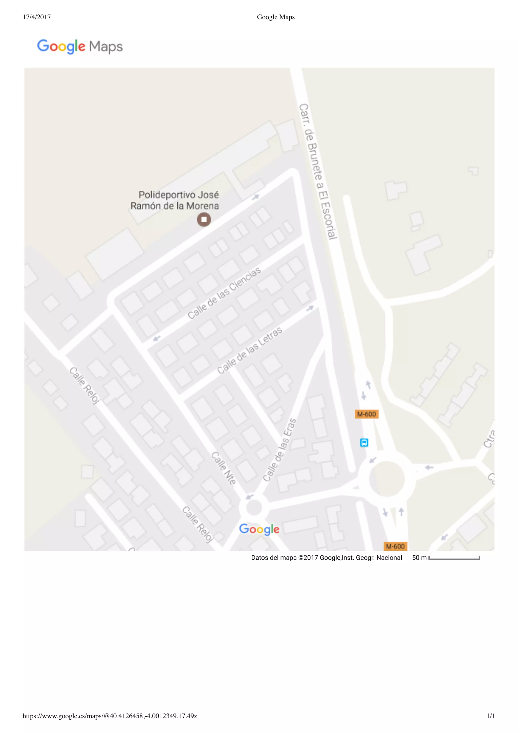 El documento es un mapa de Google Maps que muestra la ubicación del IES Alfonso Moreno en Brunete, Madrid. Se proporcionan las coordenadas y se indica que los datos del mapa son de 2017 y provienen de Google e Instituto Geográfico Nacional.