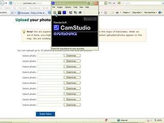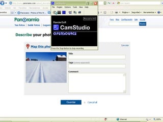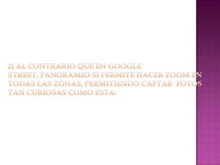 Panoramio es un sitio web que permite a usuarios registrarse para exhibir y ver fotografías de lugares y paisajes tomadas por otros, con el objetivo de aprender más sobre áreas específicas. Los usuarios pueden subir hasta 10 fotos de 2GB cada una con derechos de autor, recibir comentarios de otros y descargar imágenes en alta resolución.
