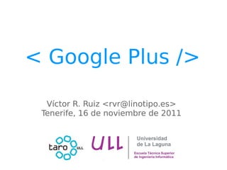 Google Plus es la red social de Google lanzada en 2011 para competir con Facebook. Permite crear un perfil personal y círculos de amigos, familia y conocidos para compartir actualizaciones, fotos y vídeos. Los usuarios pueden publicar contenido, comentar y dar me gusta a las publicaciones de otros. Google Plus ha alcanzado más de 40 millones de usuarios a nivel mundial.