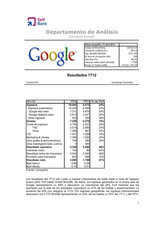 Los resultados del primer trimestre de 2012 de Google mostraron un fuerte crecimiento de los ingresos del 24% interanual hasta 10.645 millones de dólares. El beneficio neto aumentó un 61% hasta 2.890 millones de dólares. A pesar de superar las estimaciones, los inversores se mostraron cautelosos ante el descenso del coste por clic y los riesgos de la integración de Motorola Mobility.