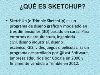 Este documento describe el programa SketchUp. Explica que SketchUp es un programa de modelado 3D desarrollado originalmente por @Last Software y ahora propiedad de Trimble. Se enfoca en facilitar el diseño 3D de una manera intuitiva para cualquier persona. Incluye características como tutoriales en video y una galería de objetos para ayudar a los usuarios a aprender y crear modelos 3D de edificios, personas y otros objetos.