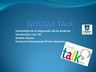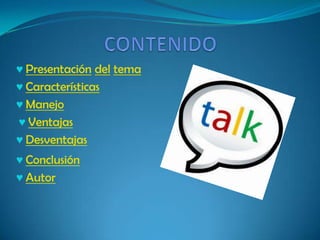 Google Talk es un servicio de mensajería y llamadas de voz que permite la comunicación en tiempo real a través de una cuenta de Gmail. Aunque es fácil de usar y ofrece funciones como transferencia de archivos y mensajes de voz, tiene limitaciones en seguridad y en la integración con otros protocolos de mensajería. Su uso no es muy extendido, pero se destaca por su simplicidad y accesibilidad.