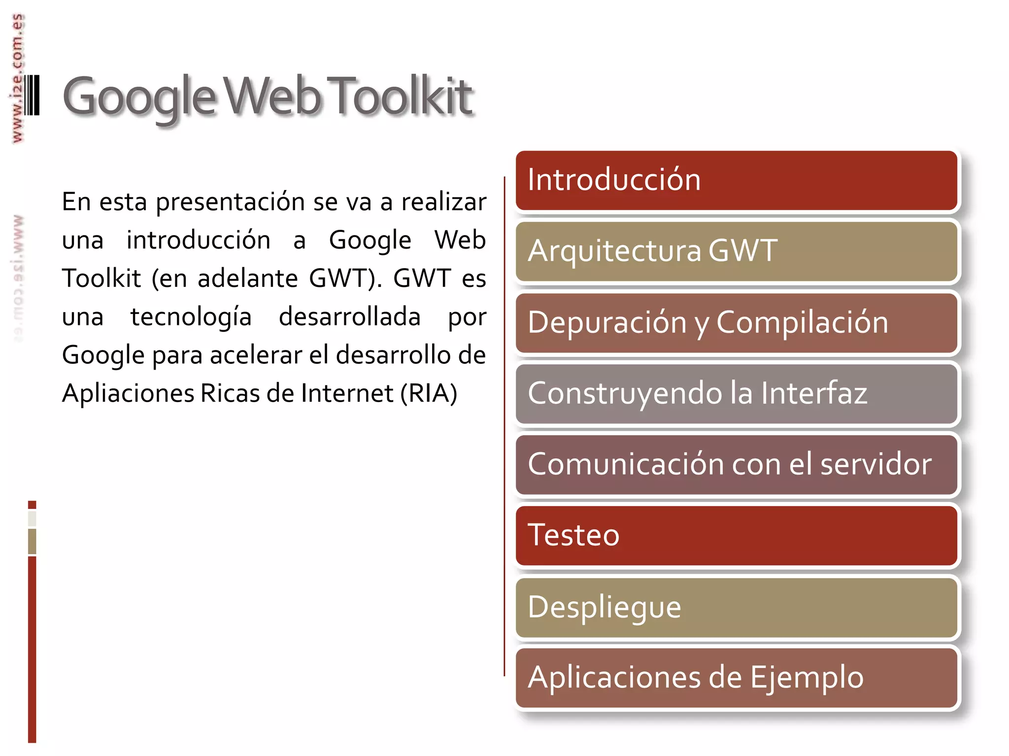 GWT permite crear aplicaciones AJAX en Java que se compilan a JavaScript para su ejecución en los navegadores. Se programa en Java, se depura en Java y se testea en Java, obteniendo un rendimiento y escalabilidad mejorados frente a las aplicaciones web tradicionales. GWT incluye bibliotecas para la interfaz gráfica, comunicación con servidores, internacionalización, y herramientas para el desarrollo y despliegue de las aplicaciones.