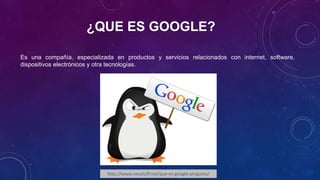 Google es una compañía que ofrece una variedad de productos y servicios relacionados con internet, software y dispositivos electrónicos. Entre sus servicios destacan la búsqueda web, Google Maps, y varias aplicaciones, como Gmail y Google Drive. Además, Google proporciona herramientas para medios de comunicación y tendencias de búsqueda.