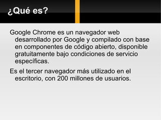 Google Chrome es un navegador web gratuito desarrollado por Google que se lanzó en 2008. Es el tercer navegador más utilizado y tiene como objetivos principales ser seguro, veloz y estable. Chrome se caracteriza por tener pestañas flexibles, sincronización en la nube, traducción integrada y un modo incógnito para navegar de forma privada.
