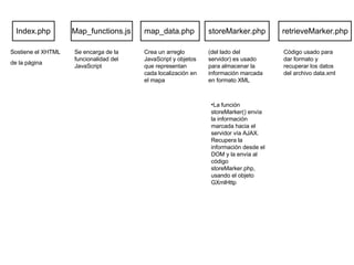 Este documento describe los componentes principales de la API de Google Maps con AJAX y PHP. Incluye objetos como GLatLng, GMarker y GMap2, así como métodos como addListener() y openInfoWindow() para interactuar con el mapa y marcadores. También explica cómo usar XMLHttpRequest y clases como GOverlay para recuperar y almacenar datos de marcadores de forma asíncrona entre el cliente y el servidor.