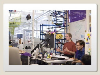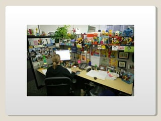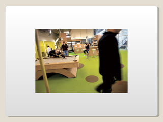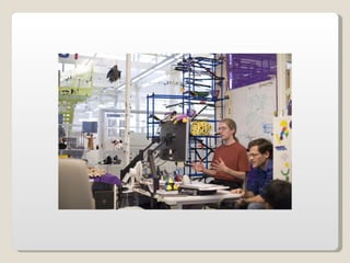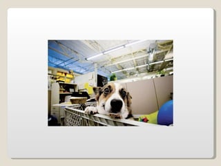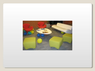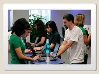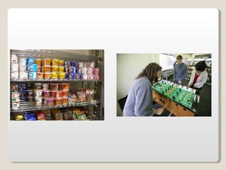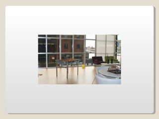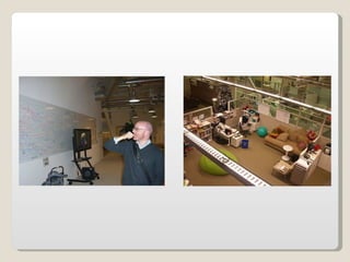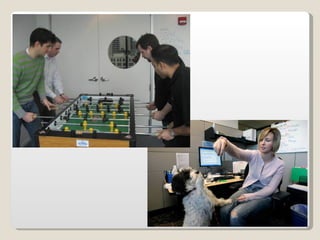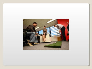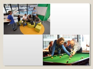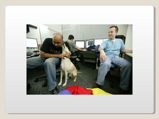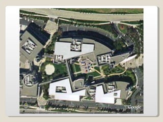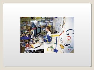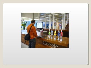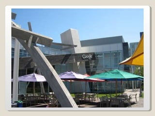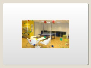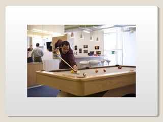 Las oficinas de Google (conocidas como Googleplex) ofrecen un entorno de trabajo relajado y cómodo para sus empleados, con comida y servicios gratuitos, horarios flexibles y espacios recreativos. Google busca retener a sus empleados tratándolos muy bien y brindándoles una infraestructura amplia que incluye patios, acceso de mascotas, futbolines, ping pong y más. Las oficinas de Google en Zurich, Suiza se muestran como ejemplo, con toboganes, cafeterías, gimnasios y salas