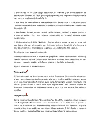 SketchUp es un programa de modelado 3D desarrollado originalmente por @Last Software y ahora propiedad de Google. Permite crear modelos 3D de edificios, objetos y paisajes de manera intuitiva utilizando herramientas como empujar/tirar, seguir, pintar, grupos y componentes. Google ha trabajado con adolescentes para despertar su interés en el modelado 3D y ha integrado SketchUp con Google Earth y Google 3D Warehouse.