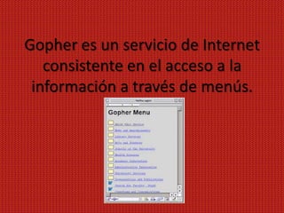 Gopher es un servicio de Internet anterior a la World Wide Web que permite acceder a información organizada en forma de menús jerárquicos. La información se presenta en nodos y hojas, donde los nodos contienen menús de acceso a otros nodos o hojas con información textual. Fue creado en 1991 y permitió pasar de un sitio a otro seleccionando opciones en los menús, dando acceso a gran cantidad de servidores gestionados principalmente por universidades u organizaciones.