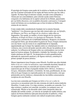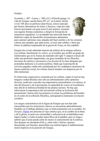 Gorgias fue un sofista y orador griego del siglo V a.C. conocido por ser el fundador de la retórica. Enseñó el arte de la persuasión a través del discurso y ganó fama y riqueza gracias a sus habilidades oratorias. Sin embargo, sus escritos filosóficos propusieron tesis escépticas extremas como que nada existe o que la verdad no puede ser conocida ni comunicada, aunque él mismo no parecía creer realmente en esas posiciones. Gorgias sentó las bases de la prosa art
