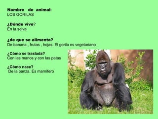 Los gorilas viven en la selva, se alimentan de frutas, hojas y bananas. Son mamíferos que nacen después de 9 meses de gestación y caminan apoyándose en sus manos y pies. Viven en grupos de 7 a 20 individuos liderados por uno o dos machos adultos con pelaje blanco en la espalda.