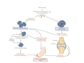 La hiperuricemia y la gota son enfermedades metabólicas causadas por niveles elevados de ácido úrico en la sangre, lo que puede causar depósitos de cristales de urato en las articulaciones y tejidos blandos, provocando artritis aguda y formación de tofos. La gota afecta principalmente a hombres de mediana edad y mujeres posmenopáusicas y se asocia con otras condiciones como la diabetes, la obesidad y las enfermedades renales. El tratamiento incluye antiinflamatorios