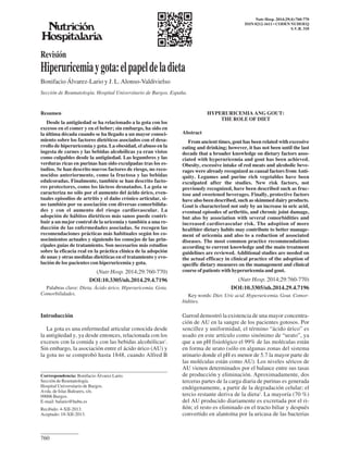 Este documento discute los factores dietéticos asociados con la hiperuricemia y la gota. Se ha relacionado la gota con los excesos alimenticios desde la antigüedad. Recientemente se ha logrado un mayor entendimiento de los factores dietéticos involucrados. La obesidad, el consumo excesivo de carnes rojas y bebidas alcohólicas aumentan el riesgo, mientras que las legumbres y verduras no lo aumentan. También se han identificado nuevos factores de riesgo como la fructosa