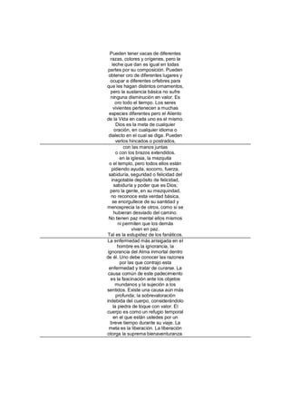 Este documento contiene una selección de enseñanzas y dichos de Sri Sathya Sai Baba. Ofrece consejos sobre vivir una vida moral y espiritual, incluyendo controlar los deseos, servir desinteresadamente, tratar a todos los seres humanos y religiones con respeto, y reconocer nuestra naturaleza divina. El objetivo es recordar la aplicación de estas enseñanzas en nuestra vida diaria.