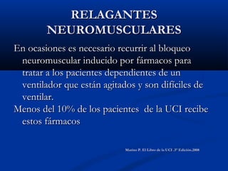 El documento describe varios fármacos relajantes musculares y analgésicos utilizados en la UCI, incluyendo el pancuronio, cisatracurio, atracurio y rocuronio como bloqueantes neuromusculares, y el fentanilo como opiáceo analgésico. Explica sus mecanismos de acción, dosis, efectos adversos y formas de administración para el tratamiento de pacientes dependientes de ventilación mecánica en la UCI.