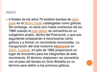 La subcultura gótica comenzó en la década de 1970 en el Reino Unido influenciada por la literatura y el cine de terror. Los góticos comparten gustos estéticos oscuros y musicales como el rock gótico, un subgénero del post-punk. El club Batcave en Londres en 1982 fue un punto de encuentro importante para los primeros góticos. Algunas de las bandas pioneras del rock gótico fueron Bauhaus, Siouxsie & the Banshees y The Cure.