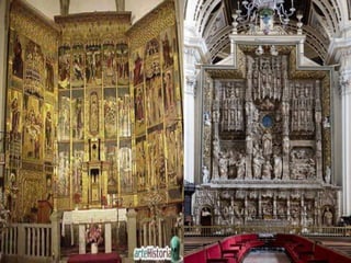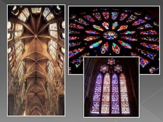 El documento describe la arquitectura gótica y sus características. El estilo gótico no solo se usó para iglesias sino también para obras civiles como palacios y ayuntamientos. Algunas características clave son el arco ojival, la bóveda de crucería y los arbotantes. También menciona ejemplos notables de catedrales y edificios civiles góticos en varios países de Europa.