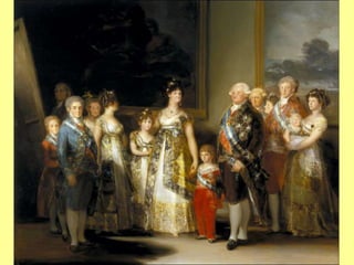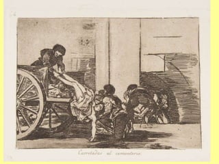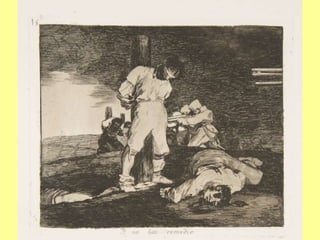 El documento resume la vida y obra del pintor español Francisco de Goya. Se divide en tres etapas creativas de Goya, desde sus primeras obras influenciadas por el rococó hasta sus últimos años donde creó pinturas más oscuras y expresionistas. Goya fue un innovador que anticipó el arte moderno con sus críticas sociales y representaciones realistas de la guerra y la condición humana.