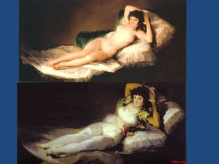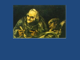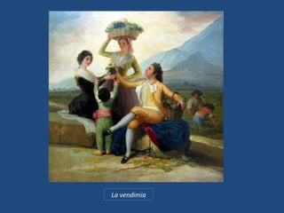 Este documento presenta una breve biografía de la carrera artística del pintor español Francisco de Goya. Se divide en tres secciones principales: su primera época donde pintó obras como "El quitasol" y "La nevada", su época como pintor de cámara donde realizó retratos como "El conde de Floridablanca" y "Carlos IV", y su última época con obras como "Los desastres de la guerra" y las "Pinturas negras" como "La lechera de Burdeos".