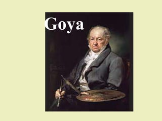 Francisco de Goya pasó su juventud en Aragón aprendiendo el estilo barroco y realizando grabados devotos. Viajó a Italia en 1770 donde descubrió el neoclasicismo, y luego se mudó a Madrid donde trabajó como pintor de cartones para tapices reales. Una enfermedad en 1793 lo llevó a desarrollar un estilo más creativo e inaugurar el romanticismo en España. Goya alcanzó la fama con sus series de grabados como Los Caprichos y Los Desastres de la Guerra, que reflejaban