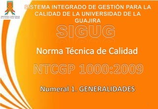 Este documento presenta los lineamientos para la implementación de un Sistema de Gestión de Calidad en entidades públicas de acuerdo con la ley 872 de 2003. Se basa en las normas internacionales ISO 9000 e ISO 9001 y promueve un enfoque basado en procesos para mejorar la satisfacción de los clientes. El Sistema de Gestión de Calidad debe ser compatible con otros sistemas como el de Control Interno y debe guiarse por principios como el enfoque al cliente, liderazgo, mejora continua y participación del personal.