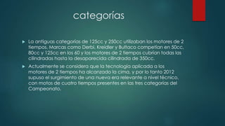 El documento habla sobre las categorías y motores de motocicletas de competición. Explica que anteriormente se usaban motores de 2 tiempos en categorías pequeñas como 125cc y 250cc, pero que en 2012 se cambió a motores de 4 tiempos en las tres categorías principales. También describe que los motores de 2 tiempos eran más potentes pero menos eficientes que los de 4 tiempos, los cuales tienen un sistema de lubricación independiente. Menciona algunas pistas como Qatar y Argentina.