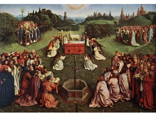 El documento describe las características generales de la escultura y pintura góticas. Explica los cambios en la concepción de las formas escultóricas desde lo románico a lo gótico, con una mayor humanización e individualización de las figuras. También analiza temas iconográficos comunes como la Virgen María, vidas de santos y animales fantásticos. Por último, destaca obras maestras de la escultura gótica en catedrales francesas e españolas como Chartres, Reims, Amiens,