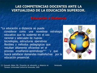 El documento describe la educación a distancia y la virtualización de la educación superior. Explica que la educación a distancia usa tecnologías para satisfacer demandas insatisfechas por la educación presencial. También describe las funciones y características del docente de educación a distancia, como diseñar contenido, administrar la educación a distancia y actualizar conocimientos. El docente virtual debe poseer competencias en pedagogía, tecnología y andragogía.