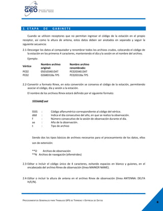 El documento detalla procedimientos para trabajos de GPS en terreno, indicando la codificación de vértices, organización de archivos y métodos de medición. Además, proporciona pautas sobre la verificación de distancias, registro de imágenes y la entrega de datos en formato RINEX. Se enfatiza la importancia de seguir un formato estandarizado y registra parámetros atmosféricos durante las mediciones.