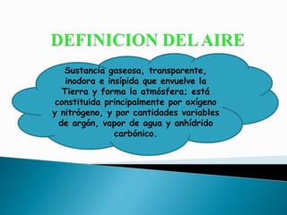 El documento describe la composición del aire y su importancia para la vida. Explica que el aire es una mezcla de gases que incluye principalmente nitrógeno, oxígeno y otros elementos. También define la contaminación atmosférica como la presencia en el aire de sustancias o formas de energía que representan un riesgo para la salud y el medio ambiente. Finalmente, ofrece recomendaciones para reducir la contaminación del aire, como manejar menos, reciclar y cuidar los bosques.