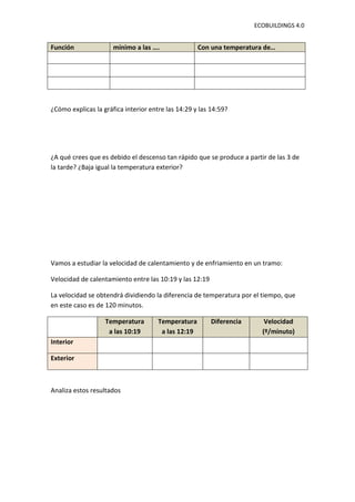 El documento analiza los resultados de la evaluación energética de un edificio, incluyendo gráficas de temperatura frente al tiempo y cálculos de velocidad de calentamiento y enfriamiento. Se discuten las temperaturas máximas y mínimas, y se sugieren medidas como mejorar el aislamiento, agregar masa térmica, captar energía solar, y mejorar la circulación del aire.