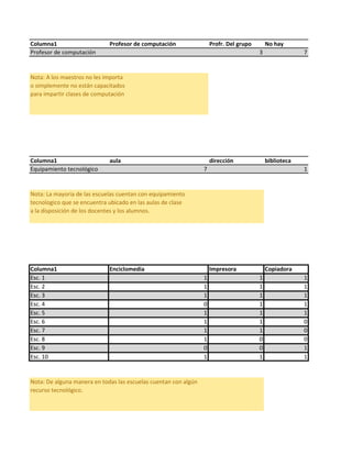 El documento analiza el nivel de tecnología en 10 escuelas rurales. Muestra que el 90% no tiene acceso a Internet, aunque la mayoría (80%) imparte clases de computación. Aunque la mayoría cuenta con equipamiento tecnológico como impresoras y proyectores, sólo el 30% tiene personal capacitado para el mantenimiento. Los maestros suelen usar sus propias computadoras (80%) debido a la escasez de equipos en las escuelas.