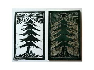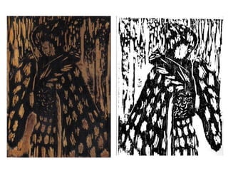 El documento describe diversas técnicas de grabado, clasificándolas en monotipo, grabado en relieve, grabado en hueco, litografía y serigrafía. Se detallan los procedimientos, materiales y herramientas utilizados en el grabado en relieve (xilografía y linóleo) y en el grabado en hueco (calcográfico). Asimismo, se explora la historia y la importancia cultural de estas técnicas, así como algunos de sus principales exponentes artísticos.