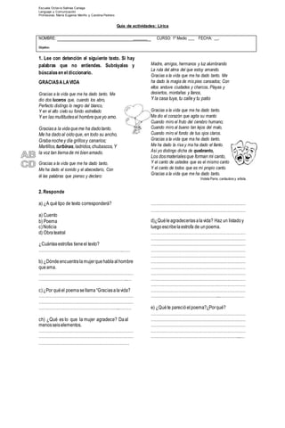 Este documento presenta un poema titulado "Gracias a la vida" escrito por la cantautora y artista chilena Violeta Parra. El poema consta de 12 estrofas y agradece a la vida por los diferentes dones que ha recibido la persona que habla, incluyendo sus sentidos, el lenguaje, la risa y el llanto, entre otros. El documento propone responder preguntas sobre el género literario del texto, el número de estrofas, a qué le agradecería la persona al vida y qué elementos la persona agradece especí