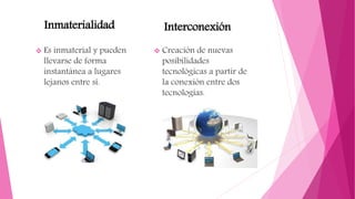 El documento describe las características clave de las nuevas tecnologías. Son inmateriales, permiten la interconexión y creación de nuevas tecnologías, y permiten la interactividad e instantaneidad en la comunicación. También permiten la transmisión de información en formatos diversos como texto, imágenes y sonido. Las nuevas tecnologías tienen influencia en todos los sectores y permiten la innovación y automatización en diferentes actividades.