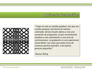 El documento habla sobre la gradación, que implica un incremento o decremento progresivo de una cualidad específica de un elemento. La gradación se puede dar por rotación, desplazamiento o cambio de tamaño y se presenta comúnmente en la naturaleza y en elementos como edificios y calles donde se aprecia la perspectiva. Es una experiencia visual diaria que genera ilusión óptica y sensación de progresión.