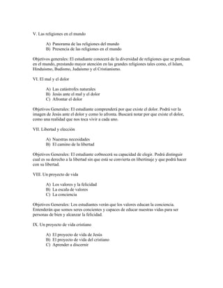 Este documento presenta un bosquejo temático para un curso de grado 11 sobre el sentido de la vida desde una perspectiva cristiana. El curso explorará temas como las preguntas sobre el sentido de la vida, diferentes respuestas y religiones en el mundo, el mal y el dolor, la libertad y la elección, los valores y un proyecto de vida cristiano, las relaciones con los demás y la sexualidad. El objetivo general es que los estudiantes razonen sobre cómo han vivido sus vidas y puedan evaluarlas a la luz de las enseñanzas