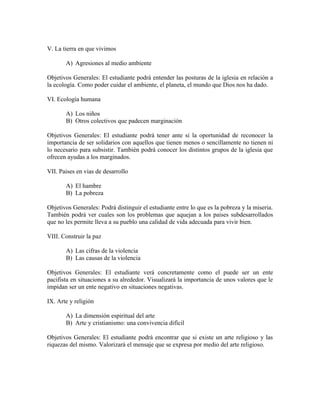 Este documento presenta un bosquejo temático para un curso de grado 12 sobre doctrina social de la Iglesia. El bosquejo incluye 13 secciones que cubren temas como la sociedad actual, las raíces del problema social, la historia de la doctrina social de la Iglesia, principios de la doctrina social, medio ambiente, pobreza, violencia, arte religioso, y Jesús y María en el arte. Cada sección tiene objetivos de aprendizaje para que los estudiantes analicen y comprendan los temas presentados.