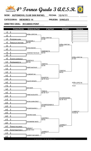 Este documento presenta los resultados del 4° Torneo de Grado 3, 14, 12 y 10 del Automóvil Club San Rafael. En cada categoría se muestra el cuadro de partidos desde la primera ronda hasta la final. Giannone M., Peña López M., Bastias F. y Tupalle A. ganaron el torneo en cada categoría respectivamente.