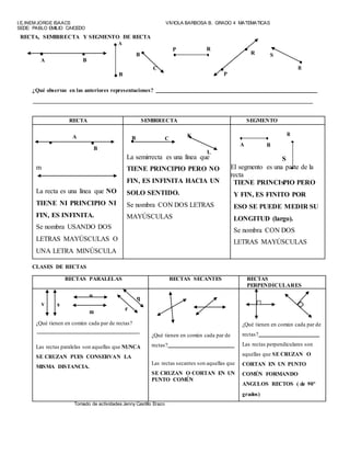 Este documento presenta una actividad para el grado 4 de matemáticas sobre rectas, semirrectas y segmentos. La actividad incluye definiciones de estas formas geométricas, instrucciones para dibujar ejemplos de cada una y completar ejercicios identificando y nombrando diferentes tipos de líneas. El objetivo es que los estudiantes practiquen y demuestren su comprensión de estas formas básicas y sus clasificaciones.