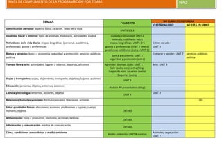 El documento resume el nivel de cumplimiento de la programación por temas en un curso de idiomas. La mayoría de los temas se cubren en las unidades del libro, aunque algunos requieren material adicional. Temas como relaciones humanas y servicios públicos no están incluidos en el libro.