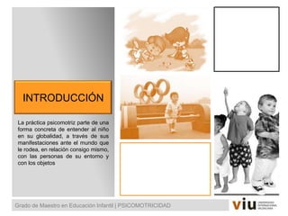 Este documento presenta la asignatura Psicomotricidad para el Grado de Maestro en Educación Infantil. Se introduce el tema de la psicomotricidad y su importancia en la educación infantil. Luego, se describen los contenidos de la asignatura, incluyendo la definición de psicomotricidad, su importancia, las capacidades básicas, el desarrollo psicomotor en niños y niñas de educación infantil, y la intervención educativa. Finalmente, se detallan las tareas, seminarios, foros y