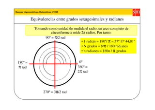 La tabla muestra equivalencias entre grados sexagesimales y radianes para ángulos comunes en un círculo. Un radián equivale a 180o/π ≈ 57o 17' 44,81'' y las fórmulas permiten convertir entre grados y radianes.