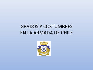 Este documento describe los grados y costumbres de la Armada de Chile. Presenta los grados de los oficiales de la Armada, desde Almirante hasta Guardiamarina. Luego describe varias costumbres navales como la ceremonia de cruce de la línea ecuatorial, el disparo de salvas en funerales, y el envío de un mensajero cuando embarca un oficial de alto rango. Finalmente, explica tradiciones como el uso de la bandera de mando, los saludos con cañonazos y el izar de la bandera nacional en los buques.