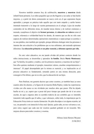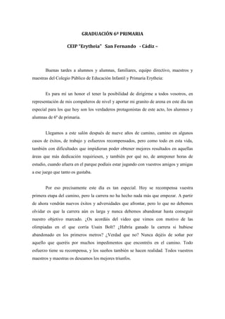 El discurso resume la graduación de 6o grado de una escuela primaria. Felicita a los estudiantes por completar la primera etapa de su educación y los anima a continuar esforzándose a pesar de los desafíos futuros. También agradece a los maestros por su dedicación a educar a los estudiantes no solo académicamente sino también en valores. Resalta el importante papel de las familias en apoyar el proceso educativo de los niños.
