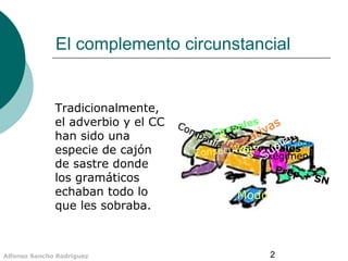 El documento resume las características del complemento circunstancial en español. Explica que los complementos circunstanciales aportan significados marginales y que su presencia o ausencia no modifica la estructura ni el sentido de la oración. También describe las diferentes estructuras que pueden tomar los complementos circunstanciales y proporciona ejemplos para ilustrarlas.