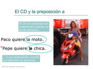 Este documento describe las características del complemento directo en español. Explica que el complemento directo es un sustantivo o grupo nominal que completa el significado de ciertos verbos y puede sustituirse por pronombres átonos como lo, la, los o las. También indica que el complemento directo se construye sin preposición cuando se refiere a cosas e ideas, y con la preposición "a" cuando se refiere a personas.