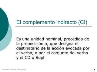 El documento habla sobre el complemento indirecto (CI) en español. Brevemente, el CI indica el destinatario de la acción del verbo y siempre va precedido de la preposición "a". Comparte rasgos con el complemento directo como ser segmentos nominales y poder aparecer pospuestos al verbo. Sin embargo, se diferencian principalmente por el uso de pronombres átonos distintos cuando se anteponen, siendo "le" y "les" para el CI.