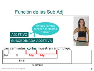 El documento explica las subordinadas adjetivas, segmentos oracionales que funcionan como adjetivos. Menciona los pronombres relativos más comunes que pueden encabezar subordinadas adjetivas (que, el que, quien, etc.) y describe sus funciones y usos. También distingue entre subordinadas adjetivas explicativas y especificativas.