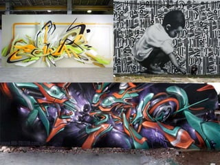 Este documento resume lo que es el graffiti, su historia y diferentes movimientos. Explica que el graffiti comenzó en Nueva York en la década de 1970 y se ha convertido en una expresión artística urbana popular. Describe los diferentes estilos de graffiti como "tagging", "bombing" y "street art", e identifica a artistas pioneros como Taki 183 y Banksy como representantes destacados del movimiento.